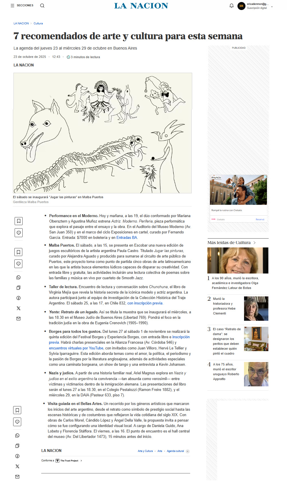 Taller de lectura. Encuentro de lectura y conversación sobre Chunchuna, el libro de Virginia Mejía que revela la historia secreta de la icónica modelo y actriz argentina. La autora participará junto al equipo de investigación de la Colección Histórica del Traje Argentino. El sábado 25, a las 17, en Chile 832, con inscripción previa.