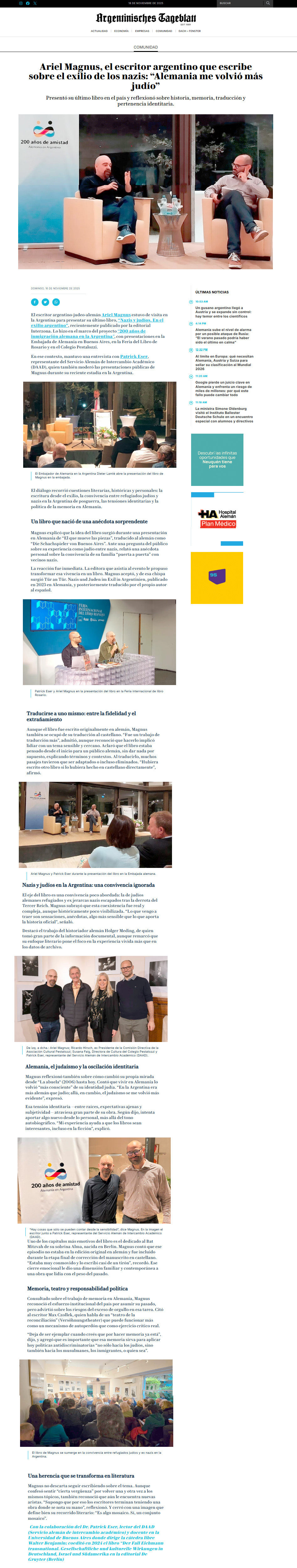 El escritor argentino-judeo-alemán Ariel Magnus estuvo de visita en la Argentina para presentar su último libro, “Nazis y judíos. En el exilio argentino”, recientemente publicado por la editorial Interzona. Lo hizo en el marco del proyecto “200 años de inmigración alemana en la Argentina”, con presentaciones en la Embajada de Alemania en Buenos Aires, en la Feria del Libro de Rosario y en el Colegio Pestalozzi.
