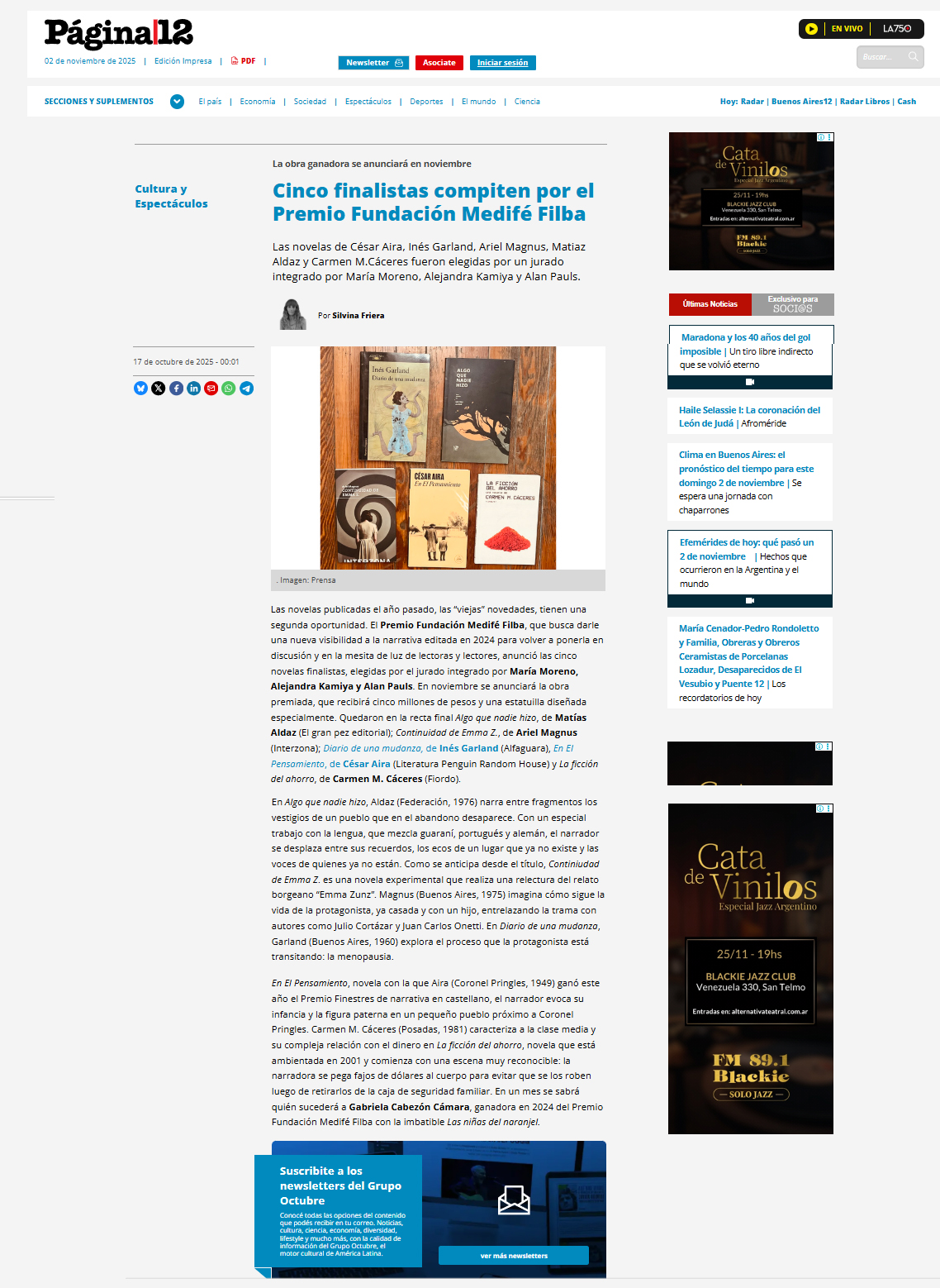 Las novelas publicadas el año pasado, las “viejas” novedades, tienen una segunda oportunidad. El Premio Fundación Medifé Filba, que busca darle una nueva visibilidad a la narrativa editada en 2024 para volver a ponerla en discusión y en la mesita de luz de lectoras y lectores, anunció las cinco novelas finalistas, elegidas por el jurado integrado por María Moreno, Alejandra Kamiya y Alan Pauls. En noviembre se anunciará la obra premiada, que recibirá cinco millones de pesos y una estatuilla diseñada especialmente. Quedaron en la recta final Algo que nadie hizo, de Matías Aldaz (El gran pez editorial); Continuidad de Emma Z., de Ariel Magnus (Interzona); Diario de una mudanza, de Inés Garland (Alfaguara), En El Pensamiento, de César Aira (Literatura Penguin Random House) y La ficción del ahorro, de Carmen M. Cáceres (Fiordo).