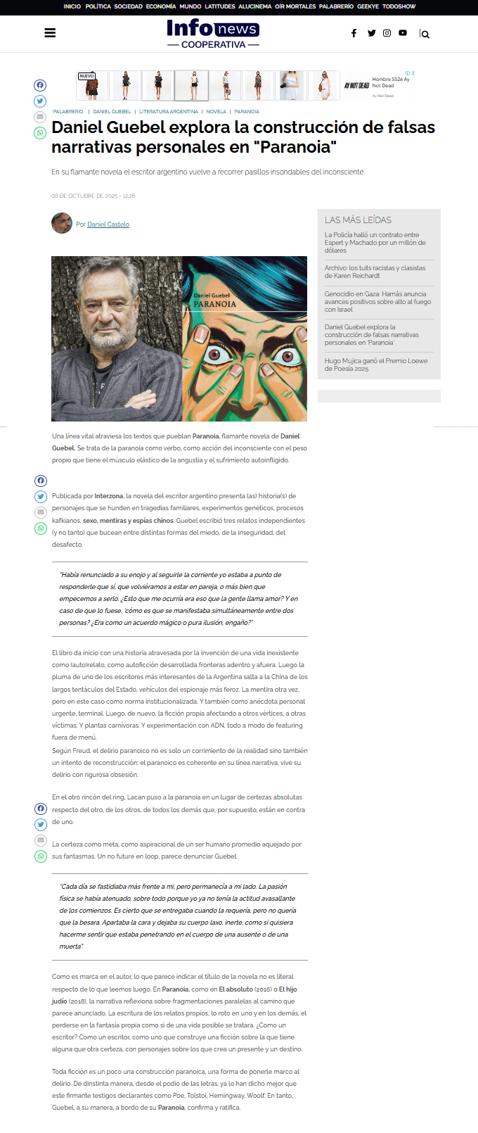 Toda ficción es un poco una construcción paranoica, una forma de ponerle marco al delirio. De dinstinta manera, desde el podio de las letras, ya lo han dicho mejor que este firmante testigos declarantes como Poe, Tolstoi, Hemingway, Woolf. En tanto, Guebel, a su manera, a bordo de su Paranoia, confirma y ratifica.