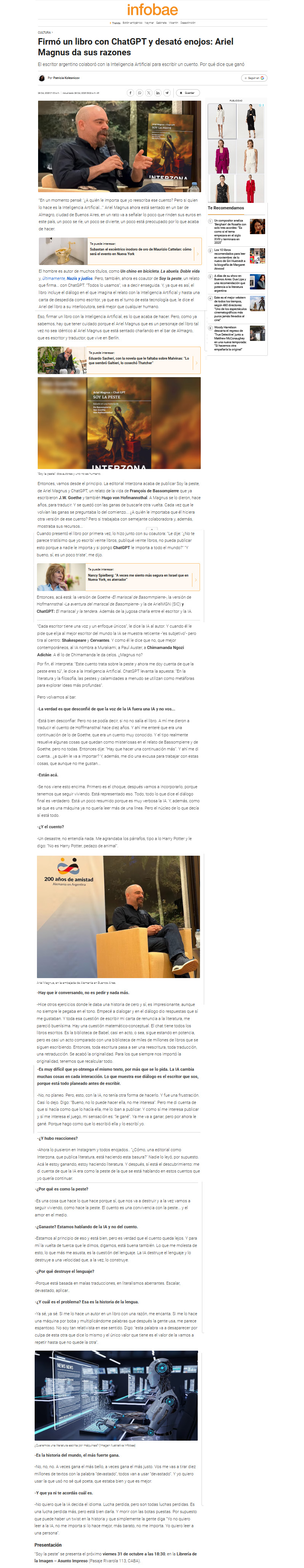 Entonces, vamos desde el principio. La editorial Interzona acaba de publicar Soy la peste, de Ariel Magnus y ChatGPT, un relato de la vida de François de Bassompierre que ya escribieron J.W. Goethe y también Hugo von Hofmannsthal. A Magnus se lo dieron, hace años, para traducir. Y se quedó con las ganas de buscarle otra vuelta. Cada vez que le volvían las ganas se preguntaba lo del comienzo... ¿A quién le importaba que él hiciera otra versión de ese cuento? Pero si trabajaba con semejante colaboradora y, además, mostraba sus recursos...
