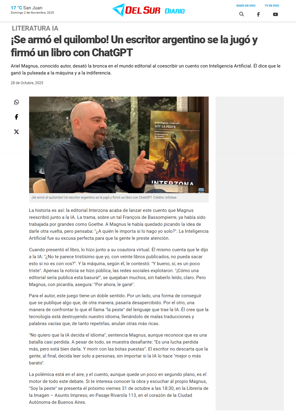 Cuando presentó el libro, lo hizo junto a su coautora virtual. Él mismo cuenta que le dijo a la IA: "¿No te parece tristísimo que yo, con veinte libros publicados, no pueda sacar esto si no es con vos?". Y la máquina, según él, le contestó: "Y bueno, sí, es un poco triste". Apenas la noticia se hizo pública, las redes sociales explotaron. "¡Cómo una editorial seria publica esta basura!", se quejaban muchos, sin haberlo leído, claro. Pero Magnus, con picardía, asegura: "Por ahora, le gané".